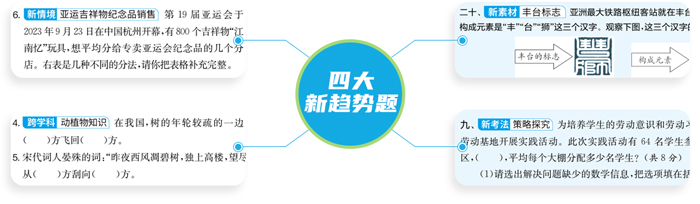 运用大数据技术,从最新两年全国教育发达地区 6338 套期末统考真题、小学毕业考试 真题、初中招生分班真题、面测题中,总结归纳出了"新情境""新素材""跨学科""新 考法"四大新趋势题,选用在图书的各个板块。