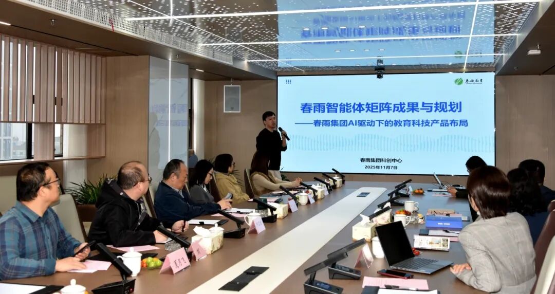 座谈会上,春雨团队汇报了图书主营业务发展现状与规划、教育智能体矩阵成果与规划,介绍AI驱动下的教育科技产品布局。