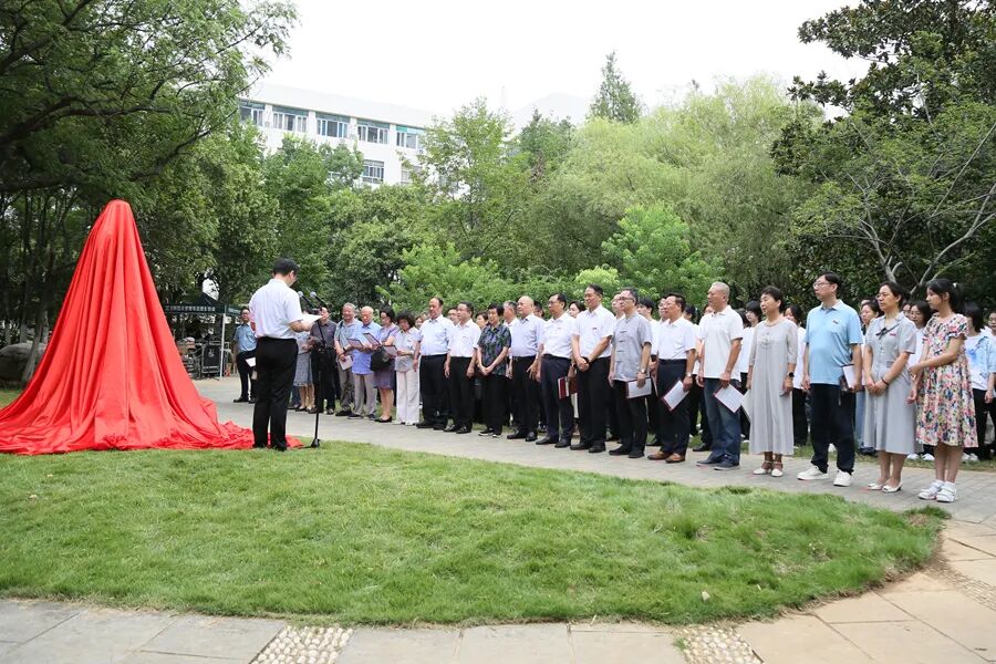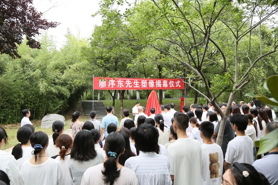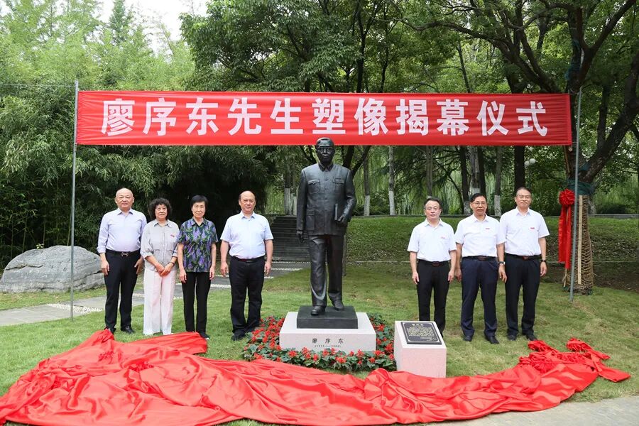 在大家共同见证下,亲属代表、校友代表、学校领导共同为廖序东先生塑像庄严揭幕。