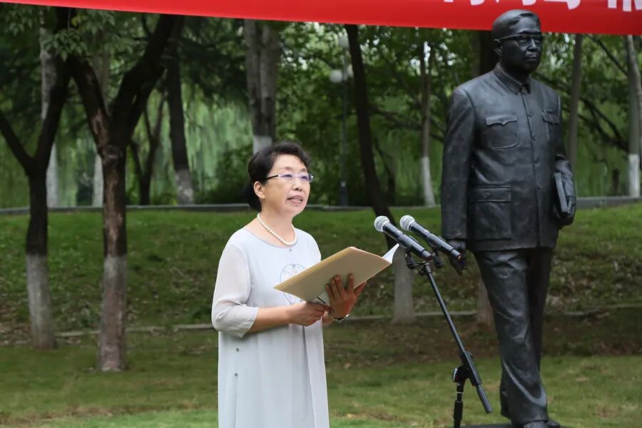 廖序东先生的女儿廖礼平女士在致辞中代表全家向塑像的捐赠者、建设者、设计者致以诚挚的谢意。廖礼平深情回忆了父亲潜心学术、教书育人以及教导子女求学的往事,表达对父亲深切的感恩与追思。她回忆,父亲总是伏案疾书,写字台上永远是打开着的书籍、写满批注的教案和学生的文章。父亲为中文系83级毕业生的题词“要教育青少年成为什么样的人,教育者自己首先就应该是什么样的人”影响了一代代师生。塑像的落成不仅是对父亲个人的纪念,更是对师大育人精神与学术传统的生动诠释,体现“教育是关爱的传递,学术是真理的坚守,传承是使命的延续”的深刻内涵。廖礼平还表达了作为校友对母校江苏师范大学的感激之情,她于1977年考入中文系,深受父亲及其同辈教师学术精神与育人情怀的熏陶,最终也走上教育岗位。